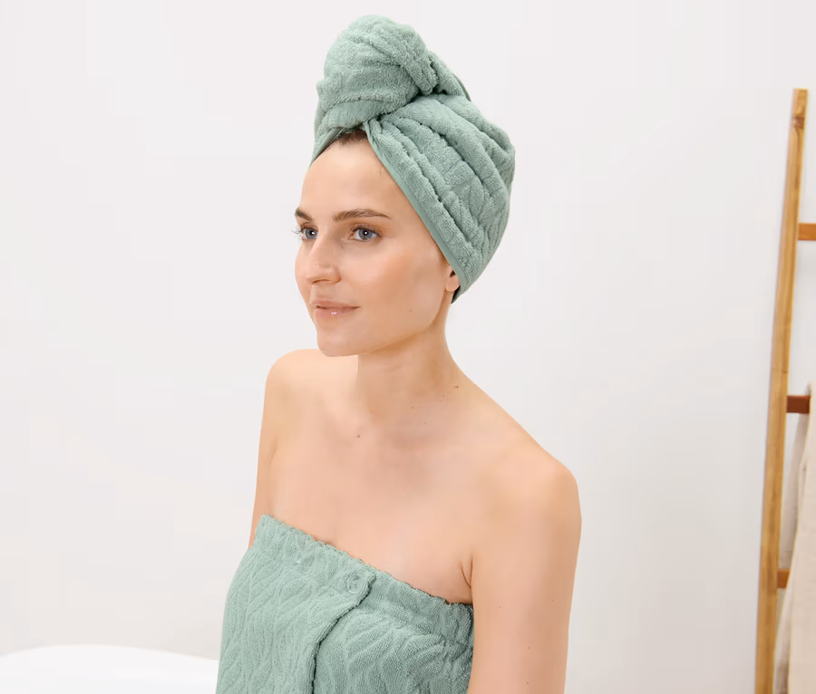 - Dieses Turban-Handtuch schützt Wasserressourcen.