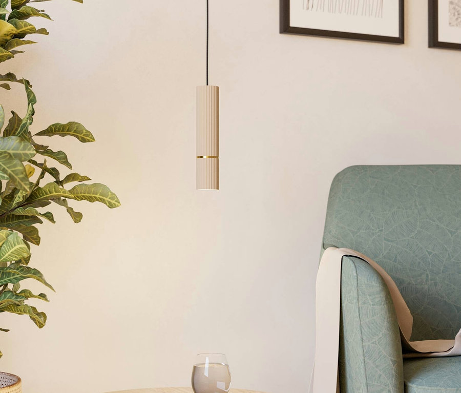 - Sandfarbene Oberfläche und dezente Details in Messing, gebürstet