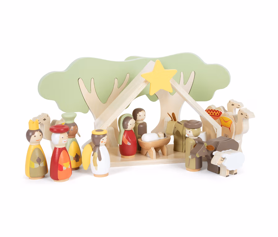 - Inkl. 1x Krippe, 2x Bäume zum Zusammenstecken, 1x Holzstall mit Steckstern, 3x Kamele, 1x Esel, 1x Kuh und 2x Schafe