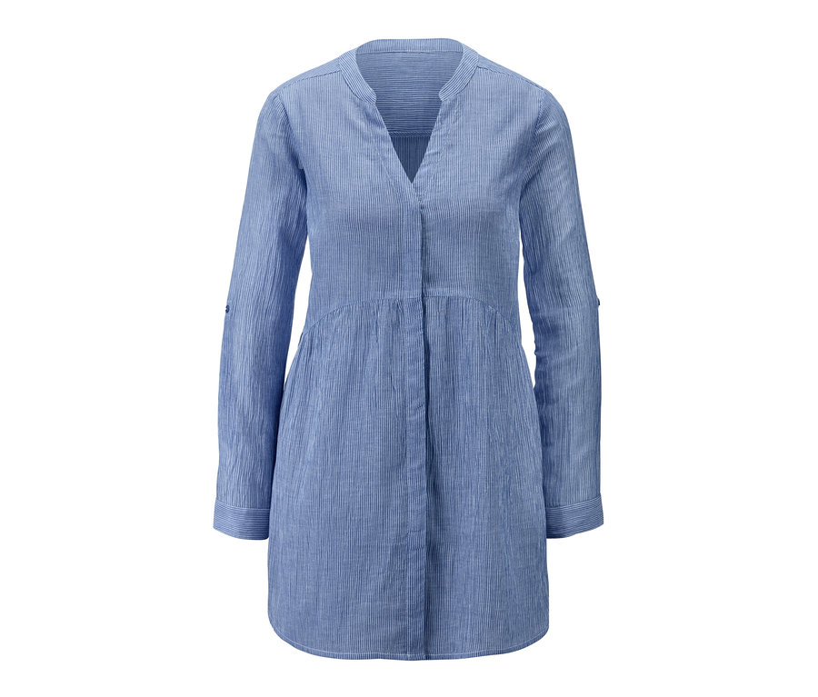 Diese gestreifte Longbluse in weich fließender, reiner Baumwolle in Kreppoptik ist einfach perfekt für coole Looks. Sie ist ausschließlich aus Bio-Baumwolle gefertigt, hat einen stylischen Tunika-Ausschnitt mit leichtem Stehkragen und Ärmel, die sich aufgekrempelt mit einem Riegel fixieren lassen.