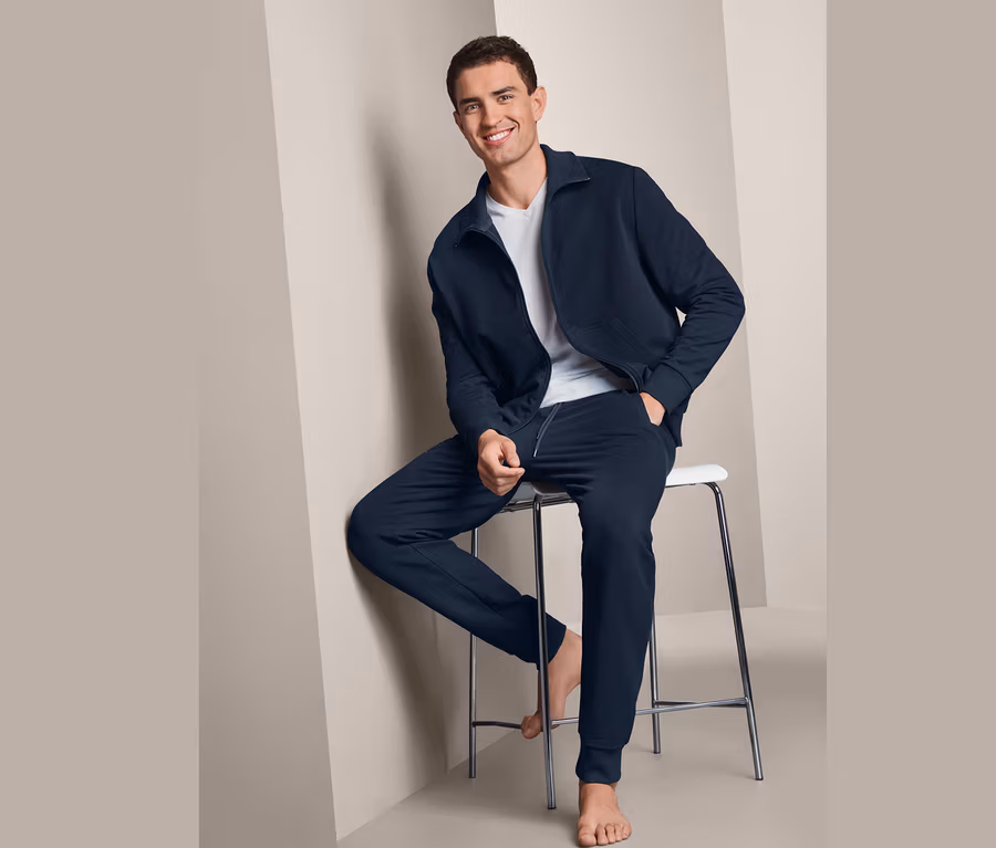 In diesen Homewear-Anzug möchte man am liebsten sofort hineinschlüpfen, sobald man zu Hause ist. Seine angenehm weiche Baumwoll-Stretch-Qualität ist unglaublich bequem und schmiegt sich bei jeder Bewegung an den Körper an. Des Weiteren unterstreicht Elasthan den hohen Tragekomfort und sorgt gleichzeitig für Formbeständigkeit und einen perfekten Sitz. Außerdem ist der kuschelige Herren-Zweiteiler mit Bio-Baumwolle gefertigt.