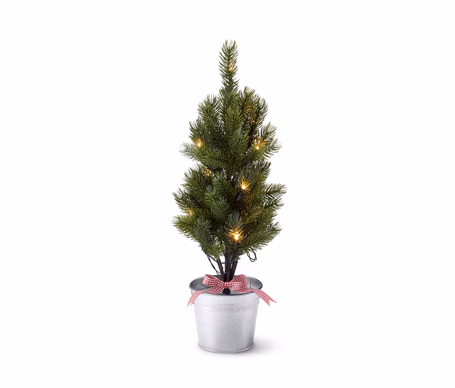 Alle Jahre wieder sorgt dieser mit 15 warmweiß leuchtenden LEDs geschmückte Weihnachtsbaum für Festtagsstimmung. Er steht in einem verzinkten Blumentopf mit dekorativer Schleife und erfüllt mit einem Satz Batterien den Innenraum für etwa 100 Stunden mit angenehmem Licht. Außerdem steuert ein Timer die Leuchten der Deko: Nach etwa sechs Stunden in Betrieb schaltet er die Leuchte aus und nach etwa 18 weiteren wieder an. Der Ein- und Ausschalter versteckt sich an der Unterseite.
