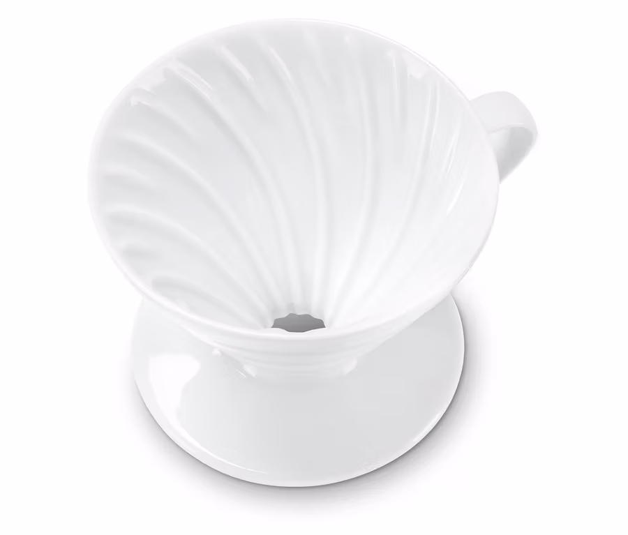 Der bekannte V60 von HARIO - das 'V' steht für die Form des Filters, die '60' für seinen Neigungswinkel. Dieser Porzellanfilter von HARIO ist ein Klassiker und sehr beliebt unter den Baristas.