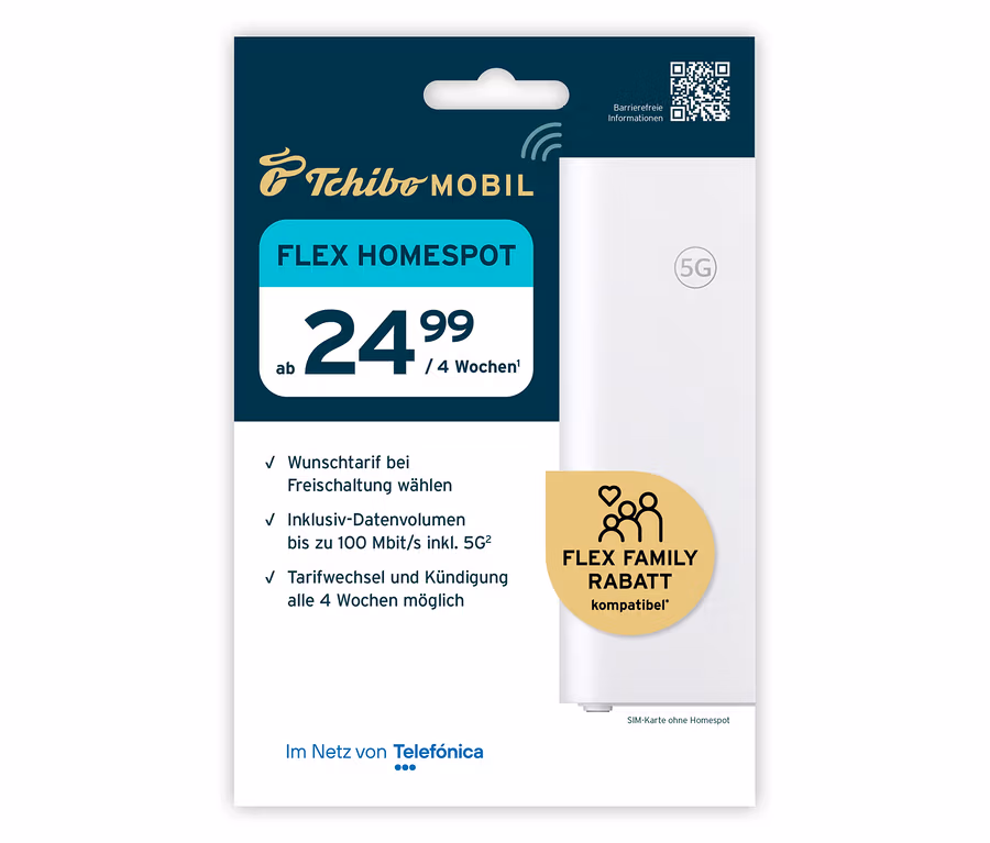 1Gilt bei Kauf einer FLEX HOMESPOT SIM-Karte (9,99 €) und Buchung einer FLEX HOMESPOT-Tarifoption. FLEX HOMESPOT-Tarife: FLEX HOMESPOT S (24,99 €/4 Wochen, 150 GB Internet-Flatrate), FLEX HOMESPOT M (34,99 €/4 Wochen, 300 GB Internet-Flatrate), FLEX HOMESPOT L (44,99 €/4 Wochen, 500 GB Internet-Flatrate). Keine Telefonie/SMS-Nutzung möglich. Datenvolumen gilt für Nutzung in Deutschland und in der EU. Bei übermäßiger Nutzung der Leistungen in der EU werden Aufschläge gemäß der EU-Fair-Use-Policy erhoben. Geschwindigkeit bis zu 100 MBit/s im Download und bis zu 25 MBit/s im Upload, ab Erreichen des Inklusiv-Volumens bis zu 64 kBit/s im Up- und Download (100-kB-Taktung). Bei den angegebenen Geschwindigkeiten handelt es sich um die jeweils techn. mögliche max. Geschwindigkeit. Die tatsächlich erreichte Durchschnittsgeschwindigkeit kann davon abweichen und ist u. a. abhängig vom Endgerätetyp und Netzausbaugebiet. Datennutzung nur mit LTE-/5G-fähiger Hardware möglich. Ungenutztes Inklusiv-Datenvolumen ist nicht übertragbar. Voraussetzung ist die Anmeldung zum Lastschriftverfahren, Laufzeit 4 Wochen mit automat. Verlängerung, Kündigung jederzeit zum Ende der Laufzeit möglich. Vertragspartner: Telefónica Germany GmbH & Co. OHG, Georg-Brauchle-Ring 50, 80992 München. Max. Abgabe 5 SIM-Karten.