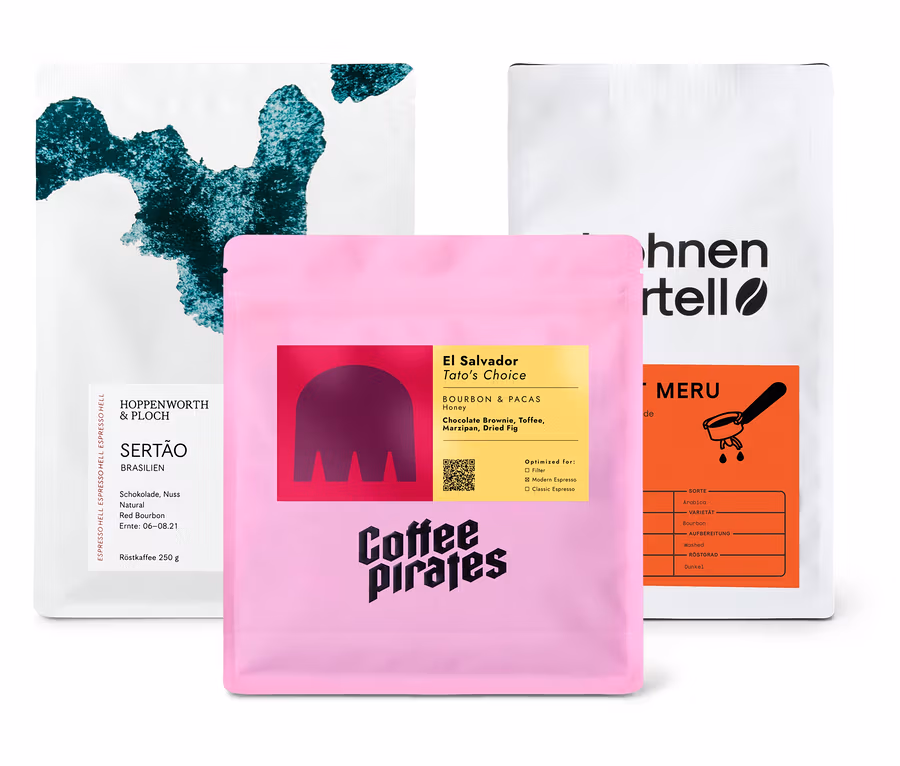- Set beinhaltet 1x Sertao Espresso von Hoppenworth & Ploch, 1x El Salvador Tato´s Choice Espresso von Coffee Pirates, 1x Mount Meru von bohnenkartell