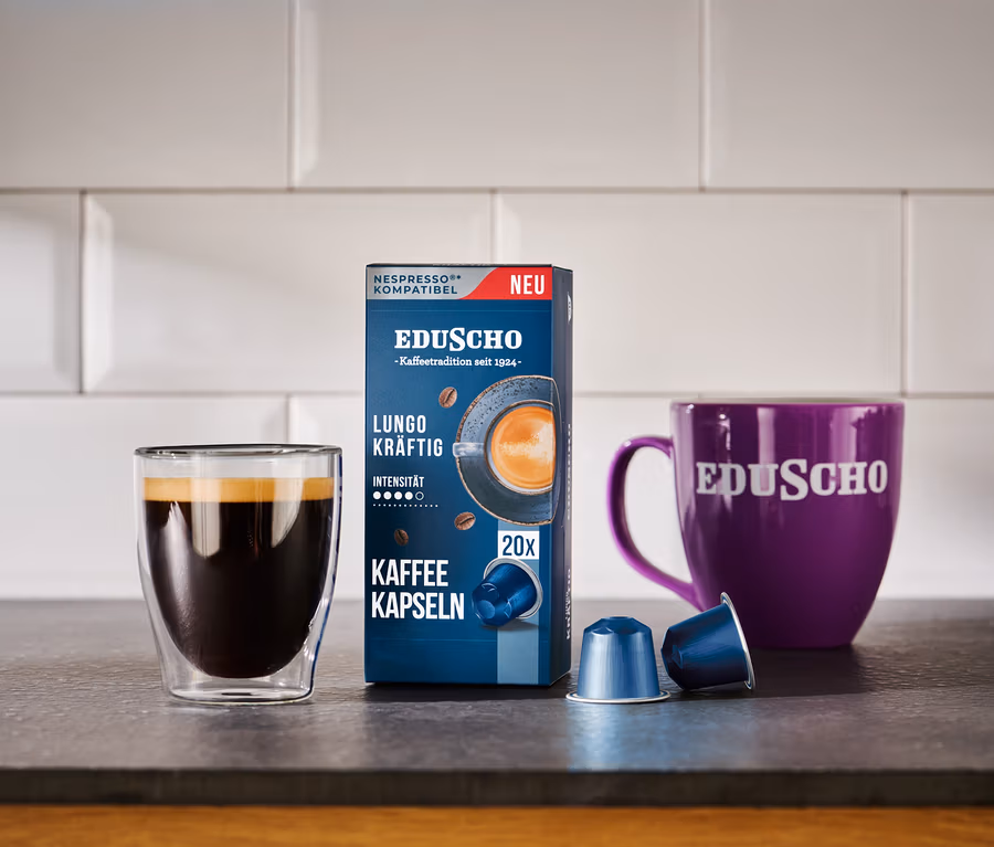 Dank der aromafrischen Versiegelung der Kapseln wird das Eindringen von Sauerstoff, Licht und Feuchtigkeit verhindert. So bleibt der Kaffee auch ohne zusätzliche Umverpackung frisch. Damit bietet Eduscho eine umweltfreundlichere Alternative als andere Nespresso®*-kompatible Kapseln.