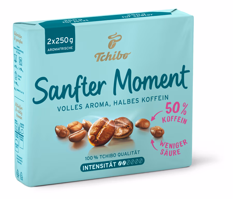 Unser Sanfter Moment, das ist ausgewogener Kaffeegenuss mit nur 50 % Koffein, aber vollem Aroma. Weniger Säure im Geschmack, weniger Bitterstoffe - für herrlich unbeschwerte Kaffeemomente zu jeder Tageszeit.