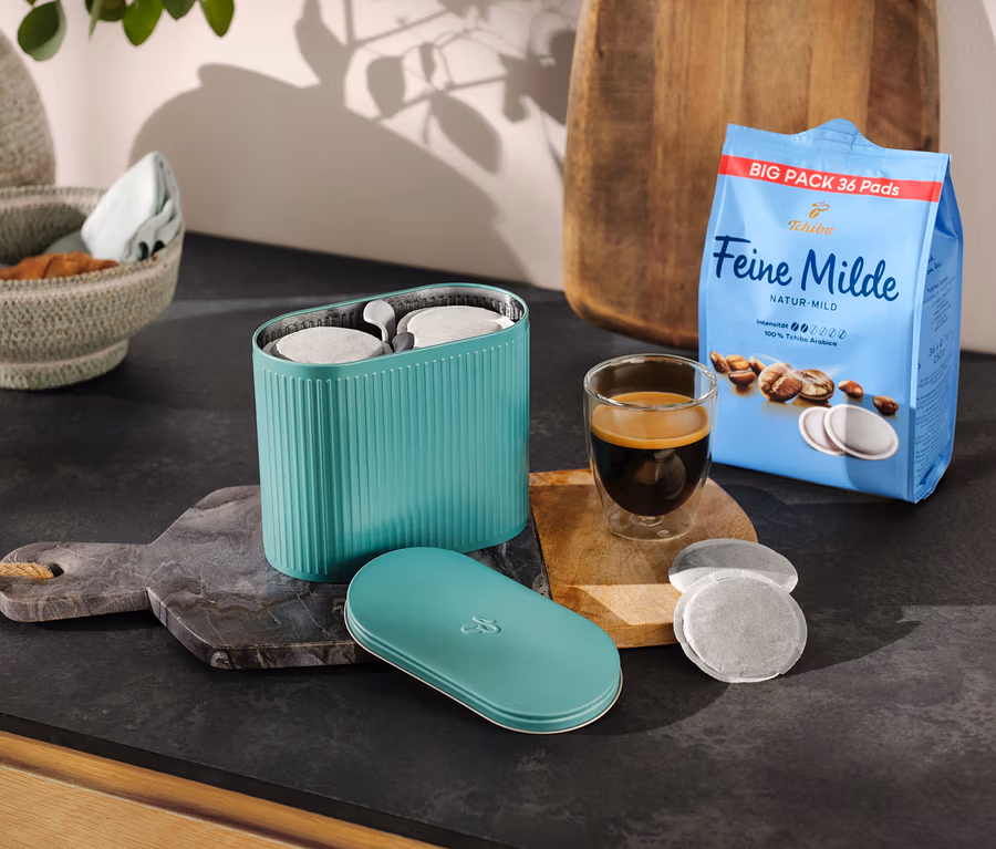In unserer Paddose bleiben Ihre Kaffeepads optimal geschützt. Die Dose fasst bis zu 36 Pads und mit den zwei integrierten Padhebern heben Sie ihre Pads mühelos aus der Dose. Dank der unterschiedlichen Farben der Padheber ist zudem eine einfache Sortierung nach Sorten, bspw. Kaffee- und Milchpads, möglich. Dabei ist die Paddose ein echter Hingucker und passt mit ihrem Rillendesign perfekt zu der Tchibo Padmaschine "Call Me Pad". Dank ihrer schmalen Maße passt die Dose in jeden Küchenschrank. Auch für die Aufbewahrung von bis zu 500 g Kaffee (gemahlen oder ganze Bohne) geeignet.